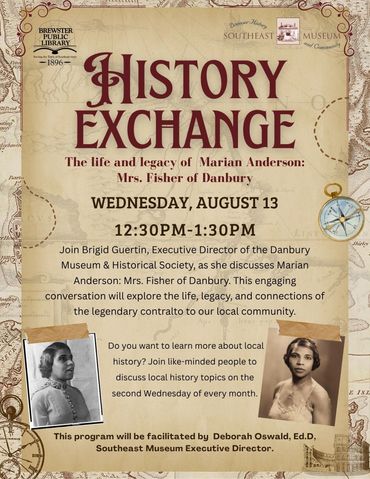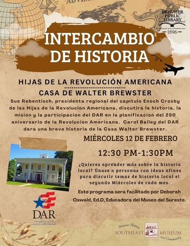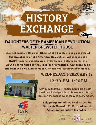Sue Rebentisch, Regional Chair of the Enoch Crosby Chapter of the Daughters of the American Revolution, will present the DAR's history, mission, and involvement in planning for Rev250 in Southeast. Carol Bailey of the DAR will give a brief summary on the Walter Brewster House as well. Please register @ https://brewsterlibrary.org/