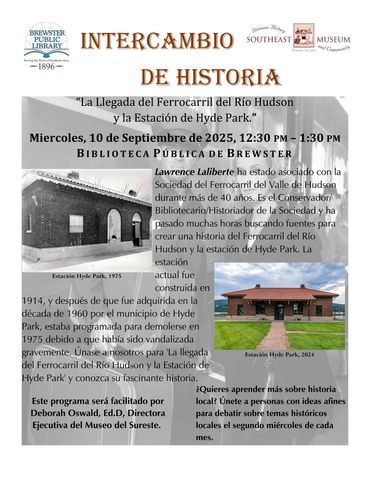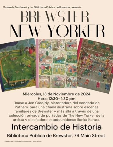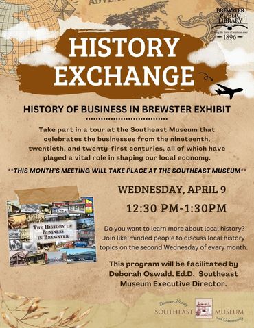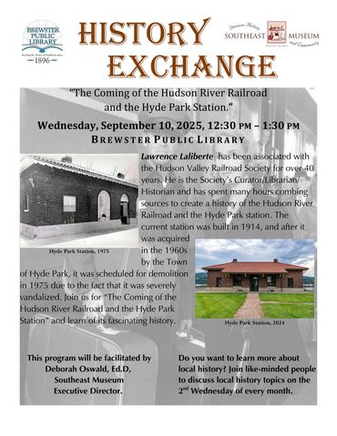 Southeast Museum has partnered with the Brewster Public Library to facilitate monthly History Exchange and History Book Club meetings. History Exchange has been extremely popular, attracting such local history experts such as Vincent D’Aquino, author of two books on Sybil Ludington, Alicia Briley, director of the Carmel Historical Society, Fleur Fairman, researcher of the Stone Chambers of Putnam County, Alexandra Johnson, niece of Brewster Standard Editor Marjorie Addis, Jack Duncan, Brewster military expert, and Jennifer Cassidy, Putnam County Historian, who will present at November’s meeting.