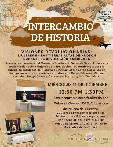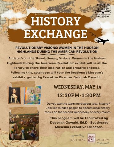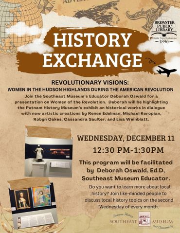 Deborah will present about the art exhibit “Revolutionary Visions, Women in the Hudson Highlands during the American Revolution". This exhibit was the kickoff event for a collaboration between the Southeast Museum and The Putnam History Museum in Cold Spring. The exhibit premiered at the museum in Cold Spring in October and will be coming to our museum in December.